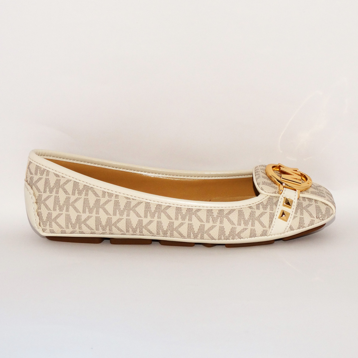 Ballerina slip‑on en tono vainilla con canvas estampado del logo signature, adornos metálicos dorados y punta redondeada. Suela de goma antideslizante. Ideal para combinar con looks neutros o pasteles, aportando lujo discreto y estilo refinado.